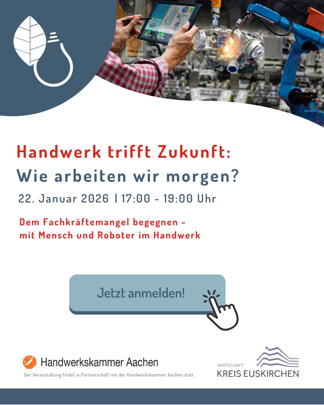 Dem Fachkräftemangel begegnen - mit Mensch und Roboter im Handwerk Erleben Sie live, wie kollaborative Roboter den Arbeitsalltag im Handwerk erleichtern. Praxisnah, verständlich und zum Anfassen direkt vor Ort.