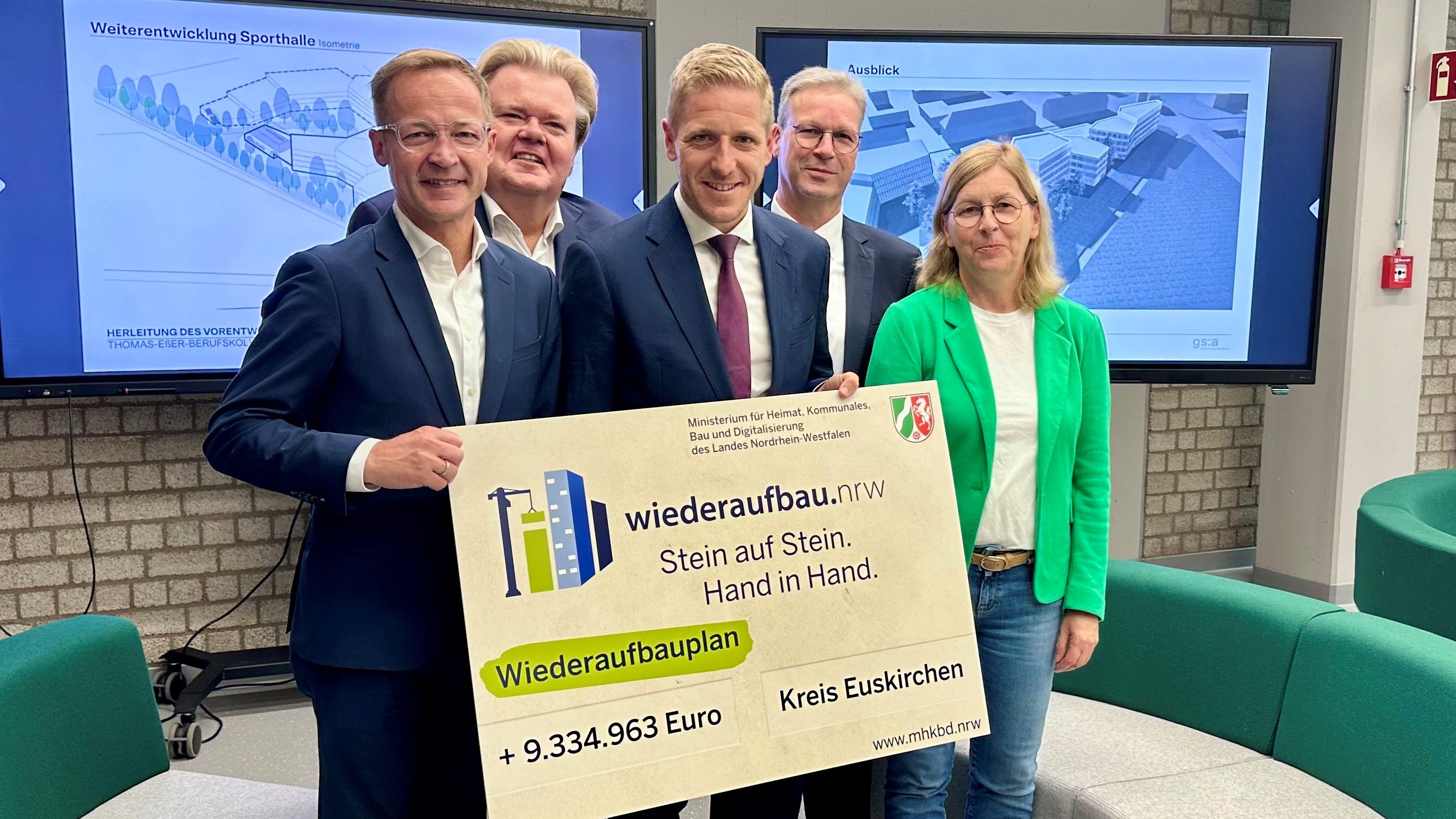 Am heutigen Montag hat Landrat Markus Ramers aus den Händen von Daniel Sieveke, Staatssekretär im Ministerium für Heimat, Kommunales, Bau und Digitalisierung des Landes Nordrhein-Westfalen, einen weiteren Zuwendungsbescheid des Landes in Höhe von 9,3 Millionen Euro erhalten. Die Mittel kommen „on top“ zu den bereits zugesagten Summen und erhöhen damit das Gesamtbudget für den Wiederaufbau auf rund 225 Millionen Euro.