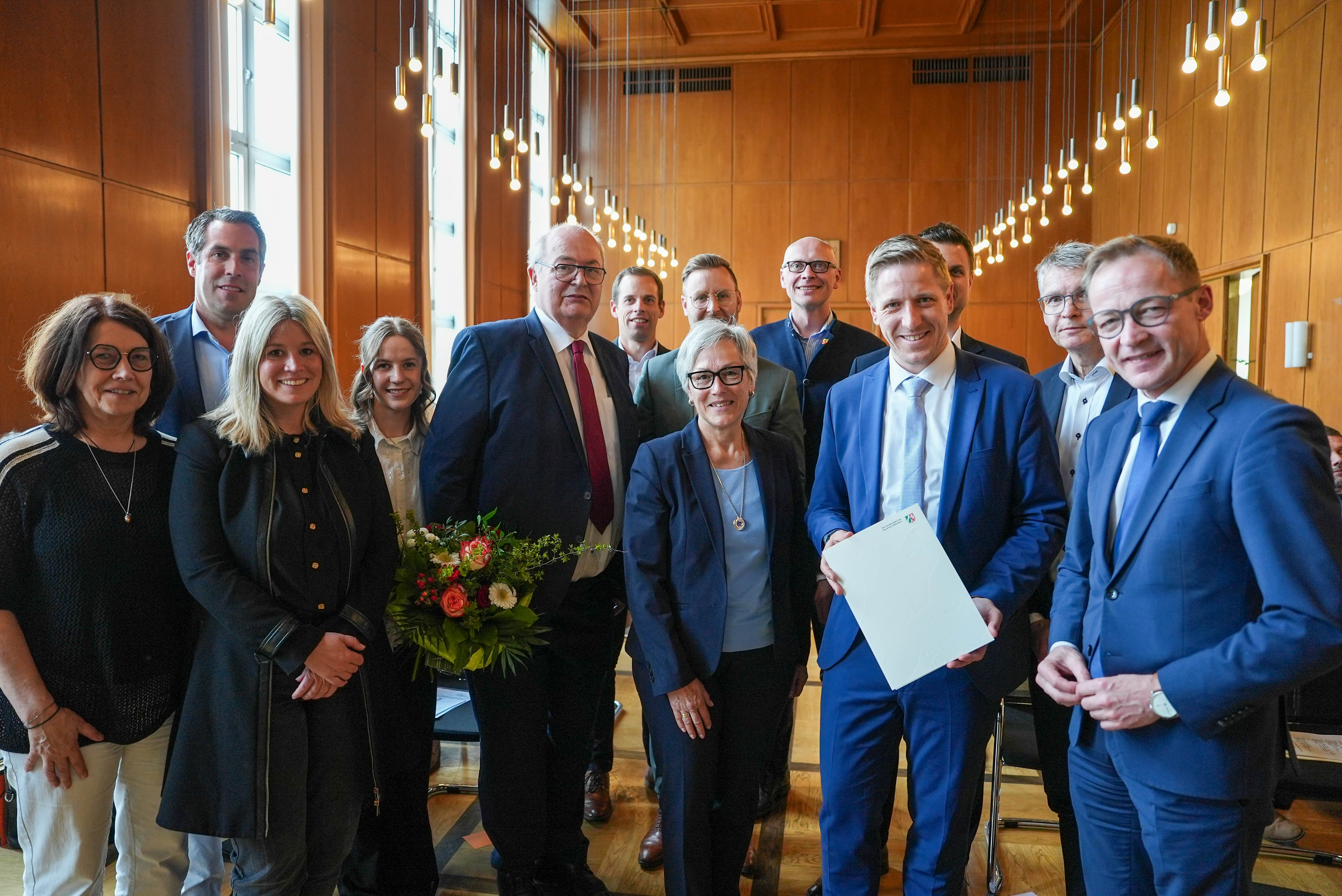 Große Freude bei der Delegation aus Euskirchen: Staatssekretär Daniel Sieveke (re.) vom Heimatministerium übergab die Auszeichnung an Landrat Markus Ramers und die weiteren Vertreter aus dem Kreis Euskirchen. Foto: MHKBD