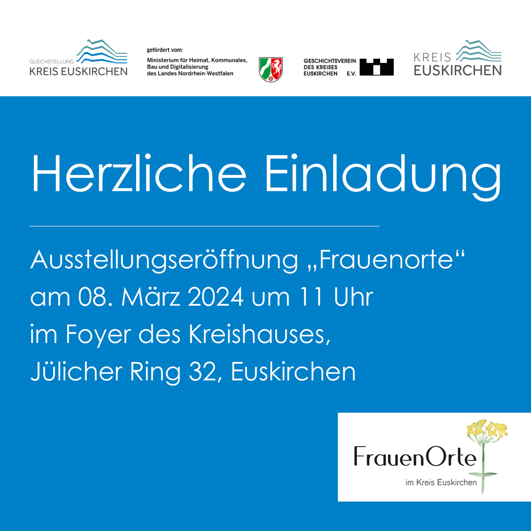 Der Kreis Euskirchen zeigt vom 08.03.2024 bis zum 27.03.2024 im Foyer des Kreishauses die vom Geschichtsverein des Kreises Euskirchen konzipierte Ausstellung „Frauenorte“.