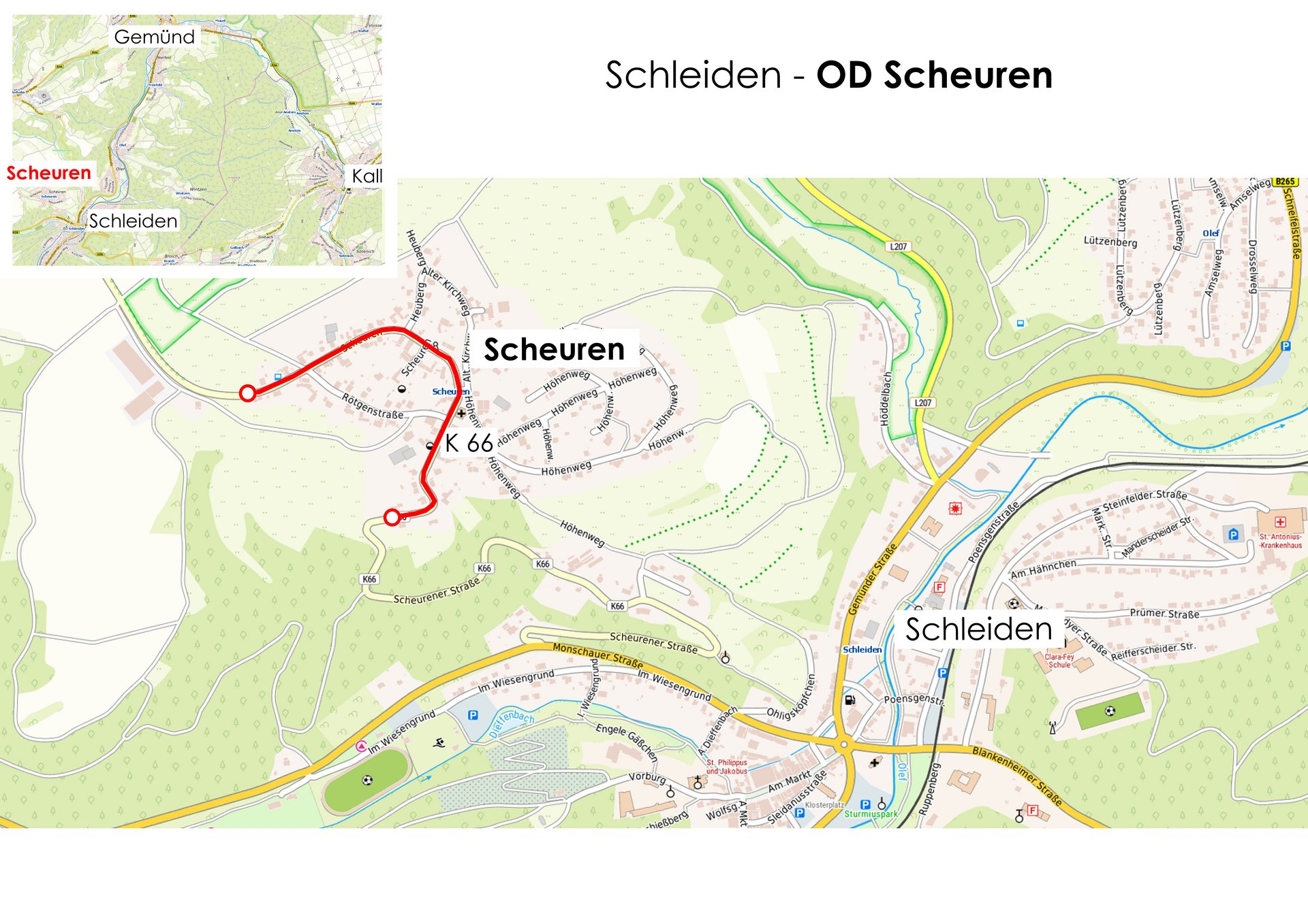 In einer Gemeinschaftsmaßnahme bauen der Kreis Euskirchen und die Stadt Schleiden derzeit die gesamt Ortsdurchfahrt Scheuren auf einer Länge von rund 770 m aus. Hierbei werden der Fahrbahnbelag einschließlich der Bordsteineinfassungen und Entwässerungsanlagen, die vorhandenen Gehwege und die Bushaltestelle erneuert und dem Stand der Technik angepasst. Wert wurde insbesondere auf durchgängig ausreichend breite Gehwege gelegt.